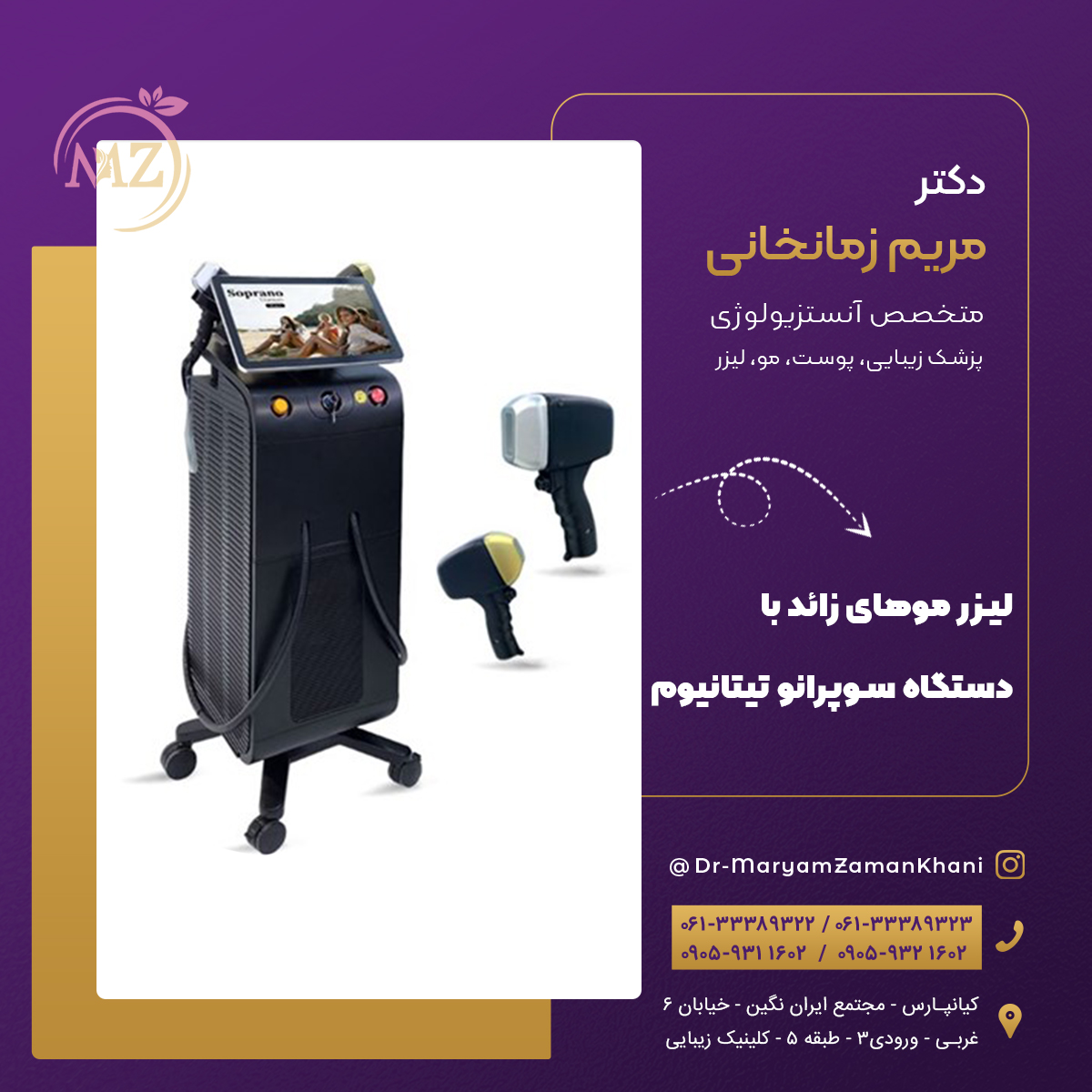 لـیزر موهای زائد با دسـتگاه سوپرانو تیتانیوم یک روش ایمن و موثر برای حذف موهای زائد است. این دستگاه از لیزر دیود برای هدف قرار دادن و از بین بردن فولیکول های مو استفاده می کند.